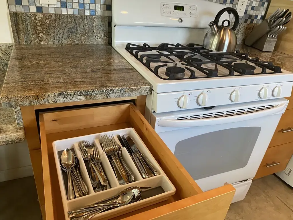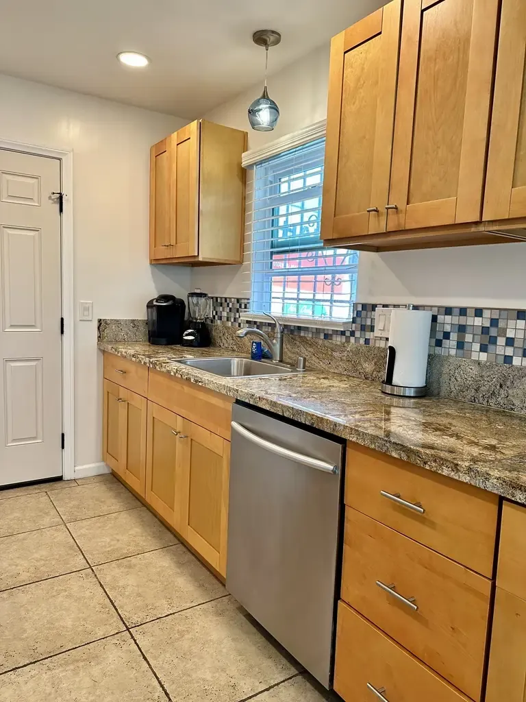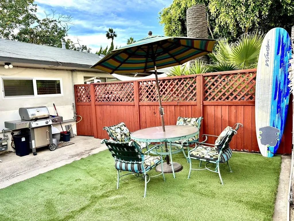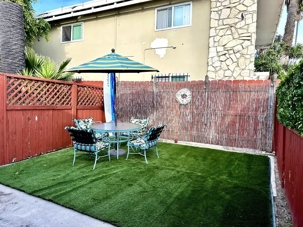 A lovely one bedroom 1 bath with a GI-NORMOUS Private yard AND walking distance to the beach. Heck it's approx 200 yards to the sand and waves! REPEAT Includes it's own private backyard with a gas bar-b cue (no need for propane ever) and lovely patio set ... BEST custom finishes loaded with granite countertops and inlaid glass tile backsplashes. Fully furnished with pots, pans, sheets, towels, tables, chairs, appliances Etc.! Check out the bathroom for the discerning as well!, designated off street parking available, modern new appliances, TV package. Sealy quality Firm 13 inch pillow top mattress, Laundry room on site. One story corner villa, THEREFORE NO NEIGHBORS above, behind or to the South. Lots of windows and tons of Natural Light.